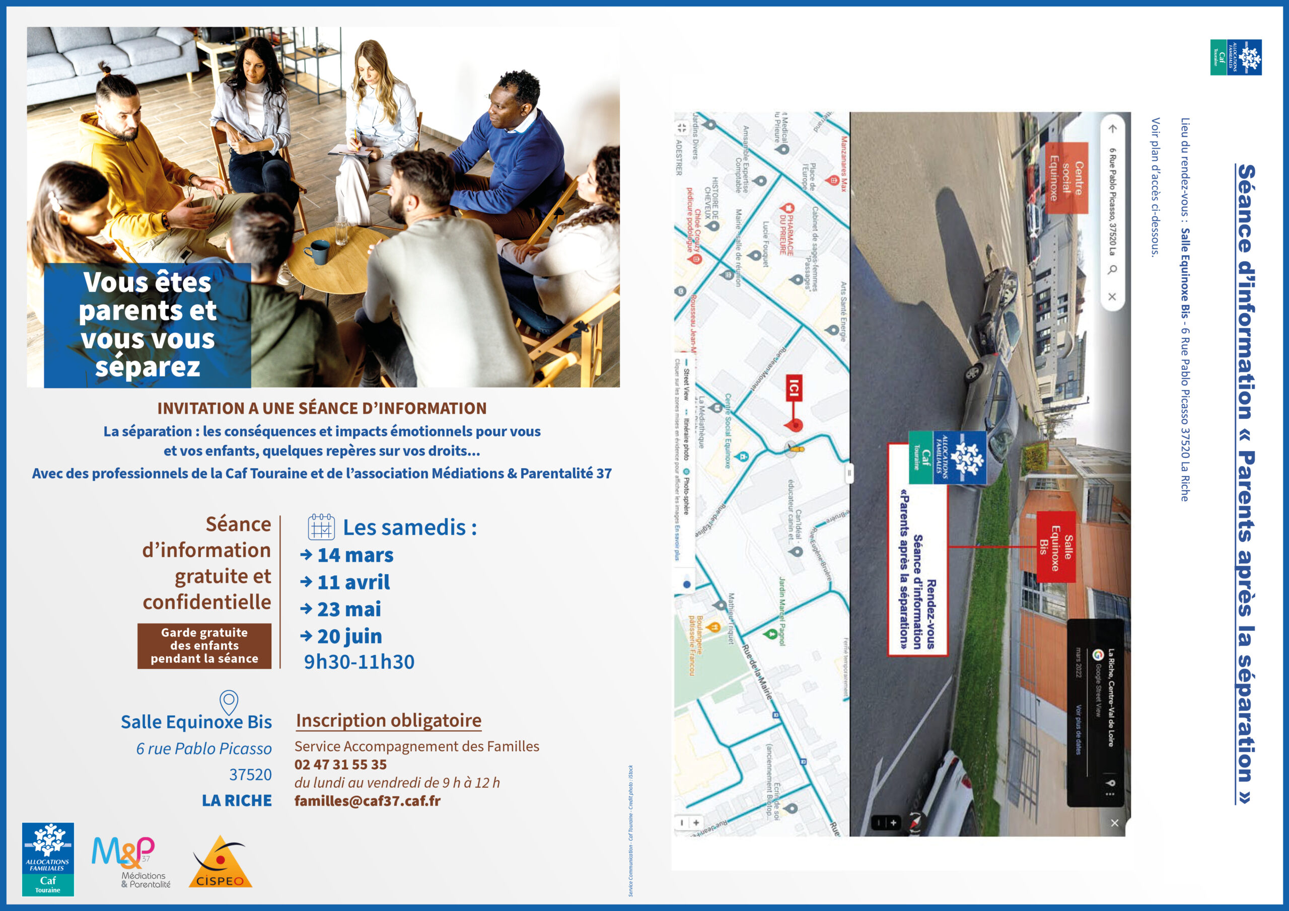 02 Mar À la une 🗓️Agenda | Les dates de prochaines Informations collectives « Parents après la séparation » Les prochaines Informations collectives « Parents après la séparation » auront lieu les samedis : 14/03 – 11/04 – 23/05 – 20/06 de 9h30 à 11h30. Salle Equinoxe bis : 6 rue Pablo Picasso 37530 La Riche.