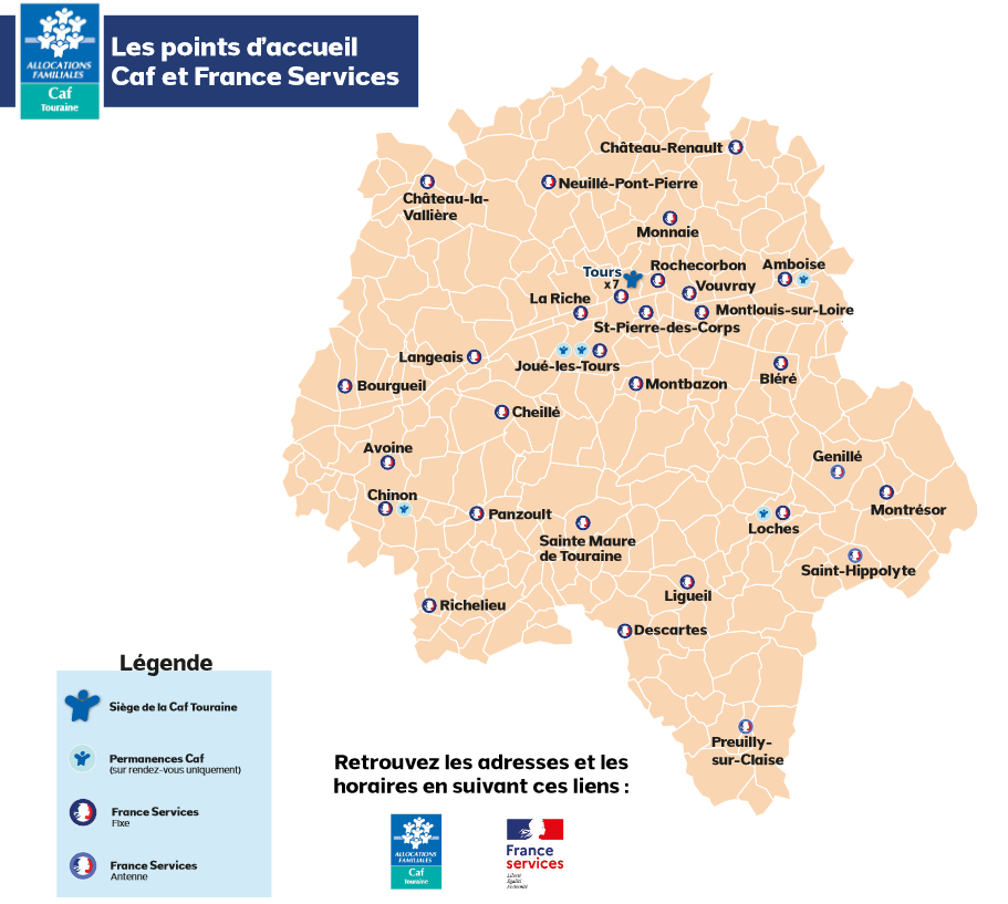 Retrouvez l’ensemble des permanences de la Caf Touraine et les France Services sur l’ensemble du territoire.